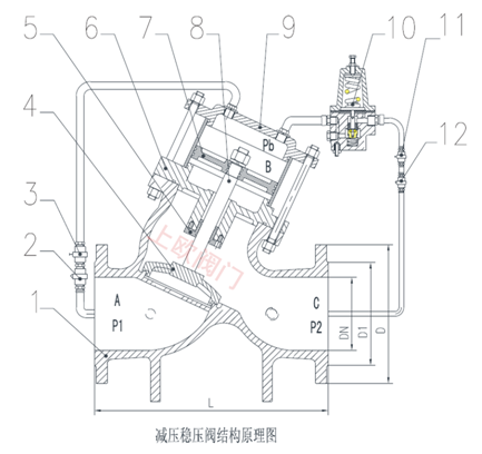 由主閥和導閥組成。主閥和導閥是分開的,導閥為控制部份,調節導閥彈簧的加載力可以變換主閥出口端壓力,使其達到調定壓力值,并利用介質自身能量的反饋作用自動保持出口壓力穩定在調定值。